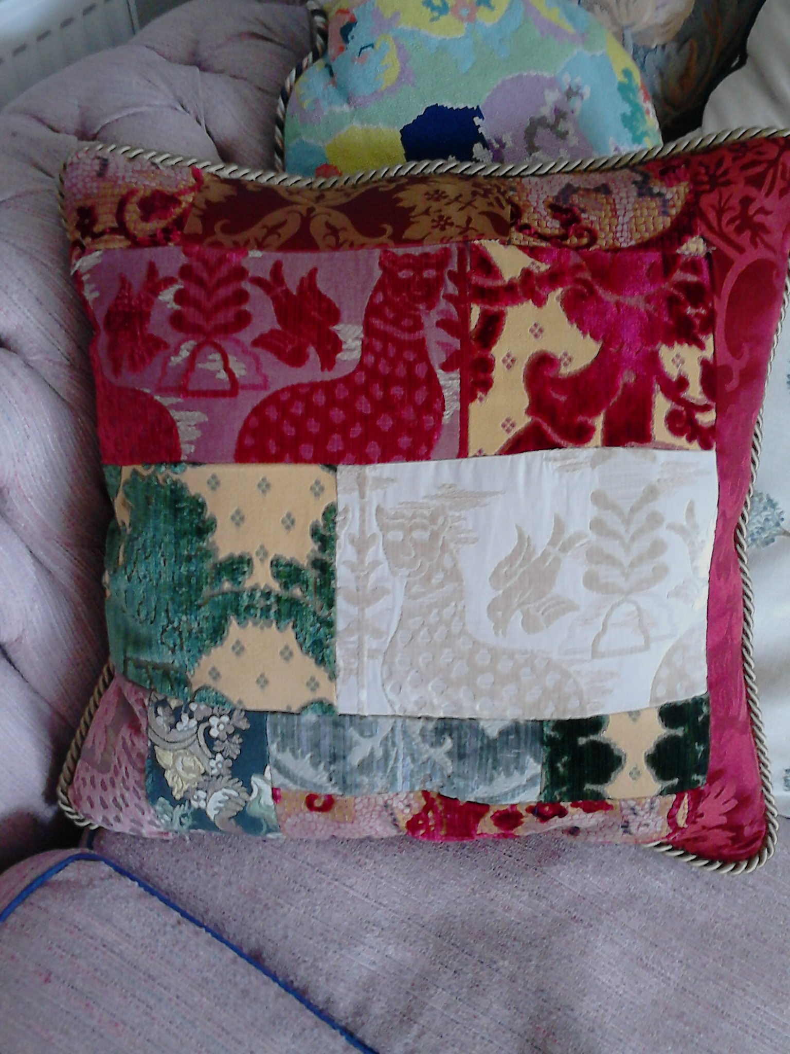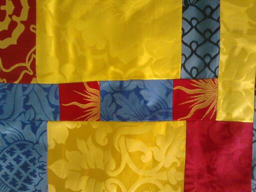 Being unable to paint, draw or even write legibly, Glynn discovered his interest in colour and design could be explored by making original patchwork designs. First fascinated by finding he could buy off-cuts and scraps of voluptuous ecclesiastical fabrics, he then delved into the treasures of car-boot sales and between the two developed an original palette and sense of design.