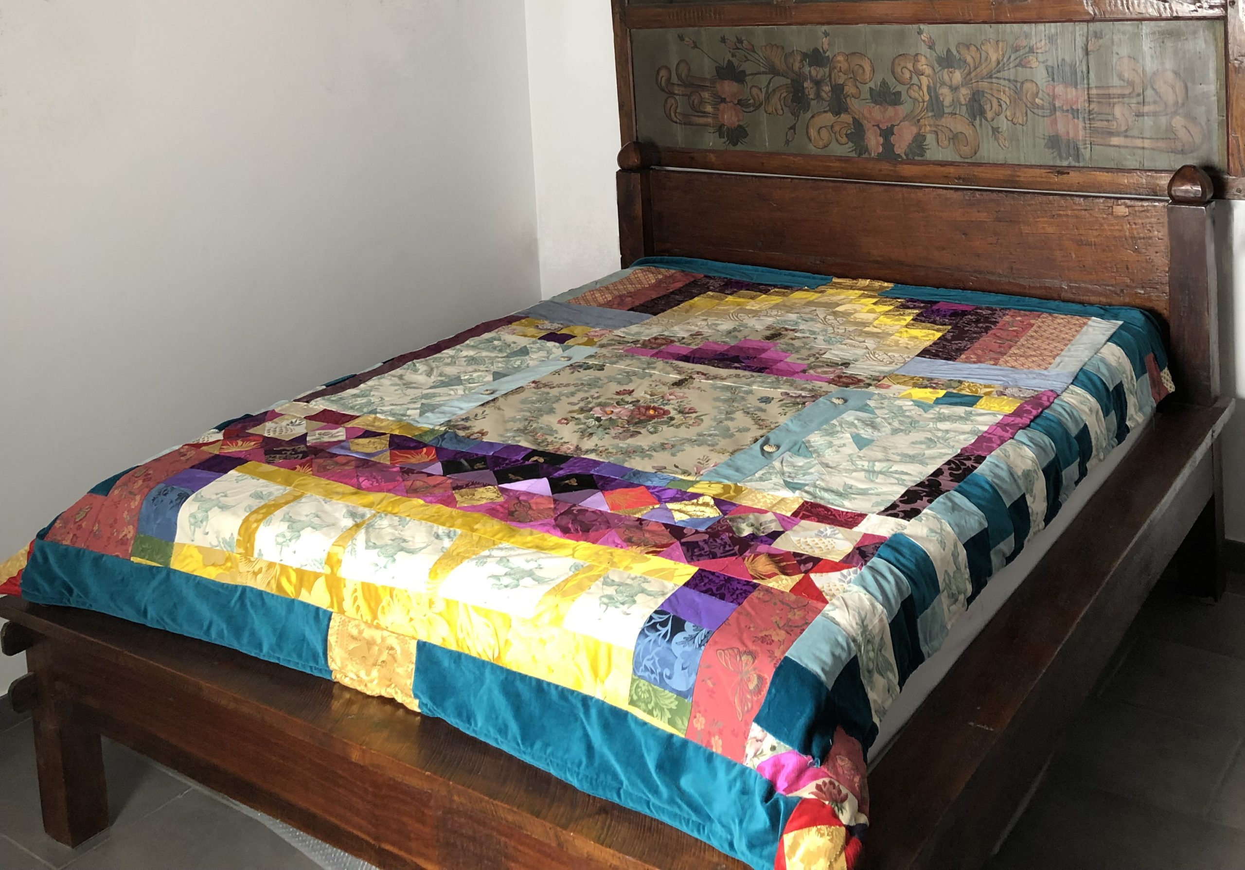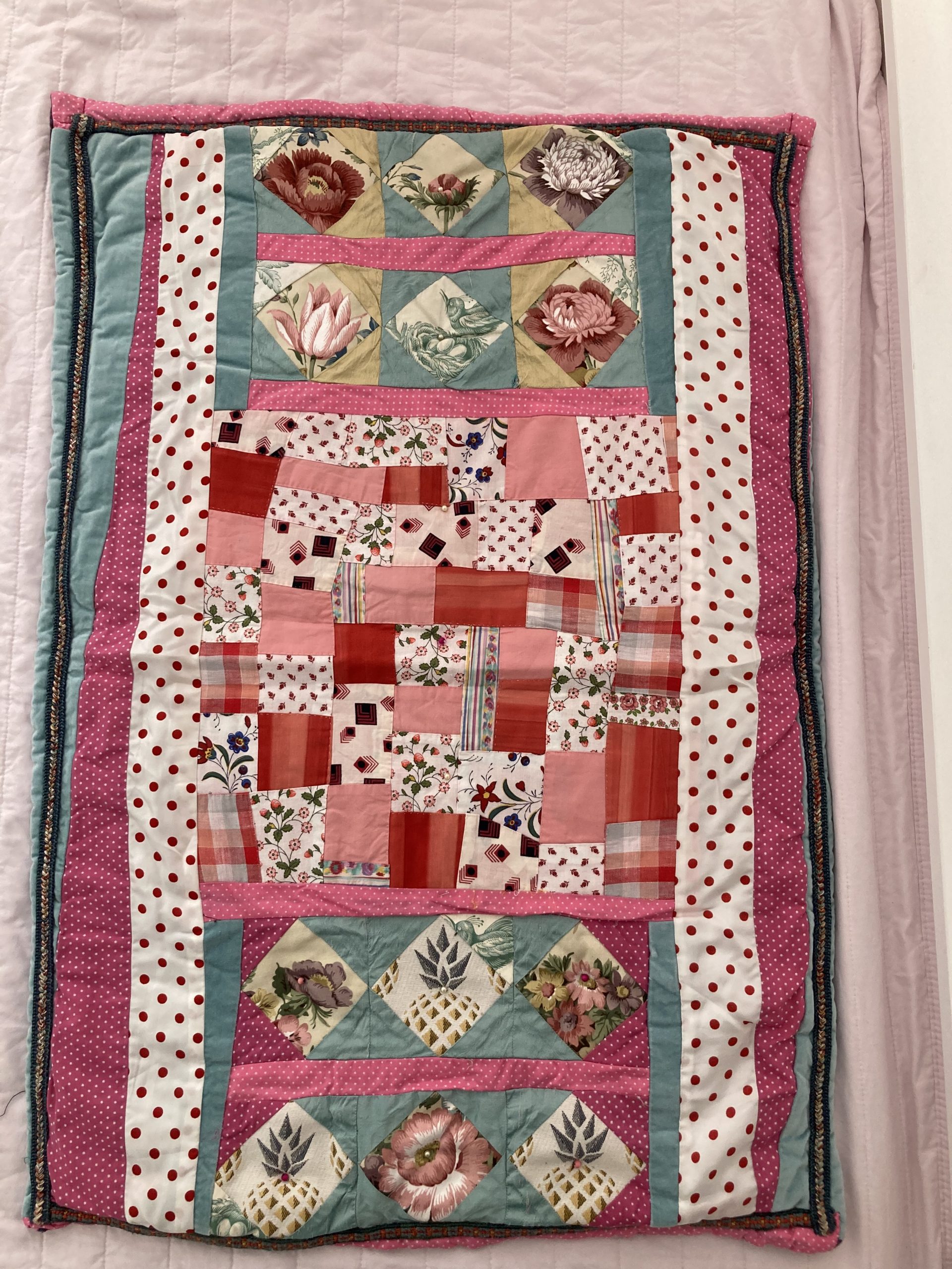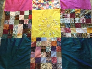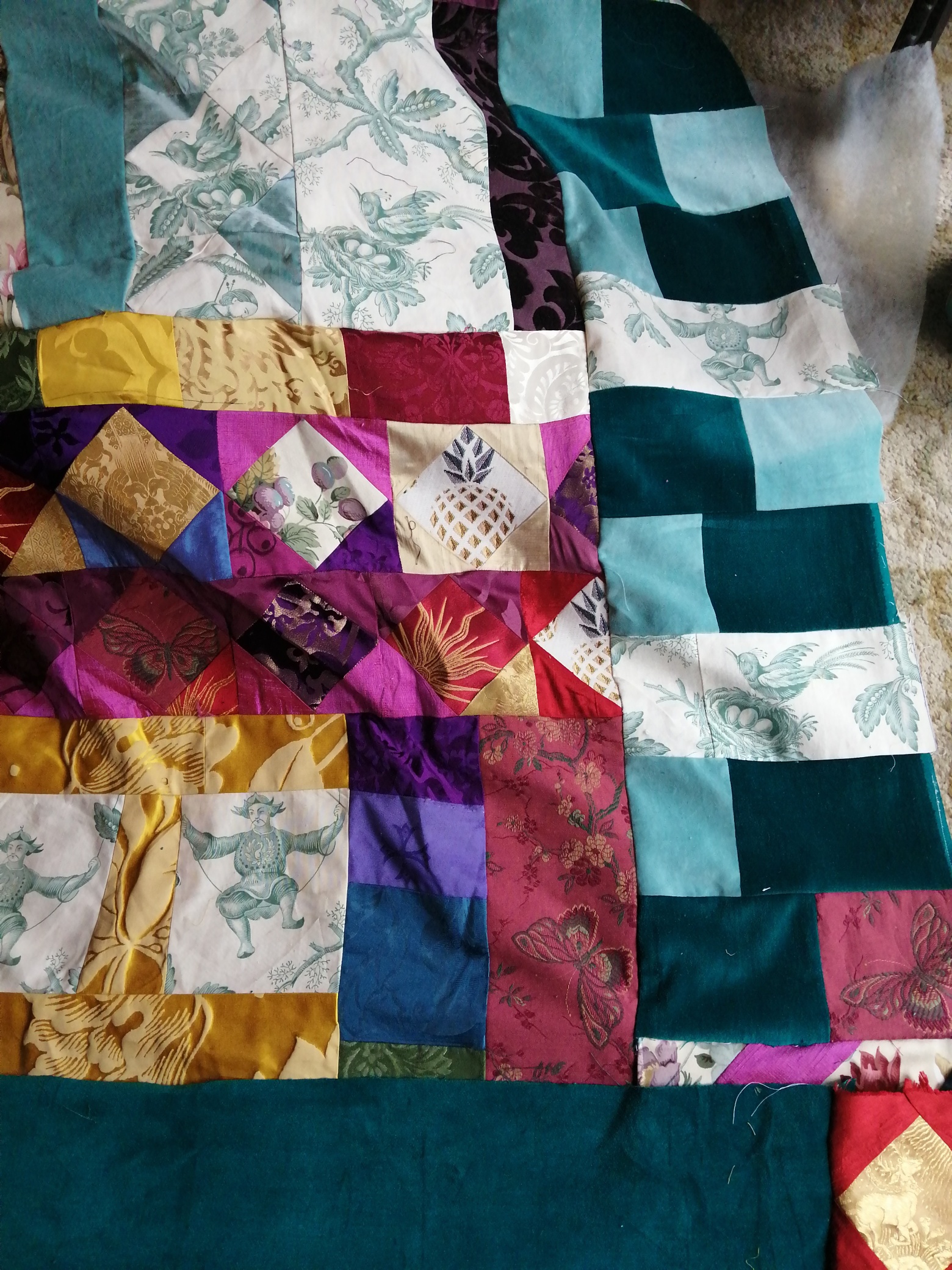 Each piece is constructed randomly, restricted by the number and sizes of fabric pieces available. ‘That’s the challenge I like, making a balanced work out of apparently disparate elements. It’s mathematical as well as creative, and that combination is really satisfying’.